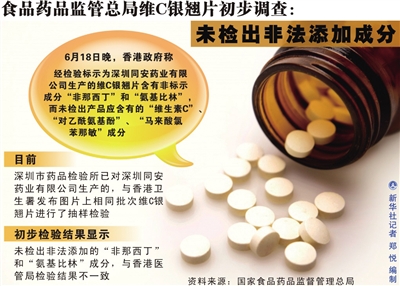 香港卫生署网上通报所配发问题药品的图片显示,该产品生产企业为“深圳同安药业”。深圳市药品检验所已对深圳同安药业有限公司开展现场监督检查和产品抽样送检。初步检验结果显示,未检出非法添加的“非那西丁”和“氨基比林”成分,与香港医管局检验结果不一致。对深圳同安药业有限公司维C银翘片的多批次检验正在进行,检验结果将及时公布。同时,广东省食品药品监管部门正在对维C银翘片样品包装进行比对,鉴别真伪。