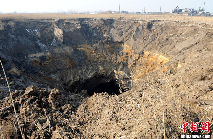 近日,位于连云港市新浦区滨河新城一条在建的公路旁突然塌陷,随后形成一个巨大的“天坑”,道路施工被迫停止。记者了解到,“天坑”位于道路边上一磷矿矿区内,距离新修的道路大约70米,新修道路有500米的路段穿越了磷矿的“采空区”。事发后,磷矿方面立即向多个相关部门进行汇报,并采取了有效防范措施。目前,对于“天坑”的处置以及道路下一步安全等方面的解决方案,正在进一步论证中。图为直径超过一百米的“天坑”。耿玉和 摄