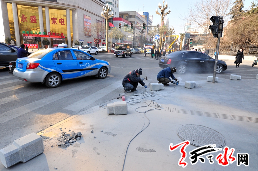 施工人员正在百货大楼十字路口南北斑马线通道处装置隔离墩,人性化的设置为市民安全通过马路提供了极大的方便