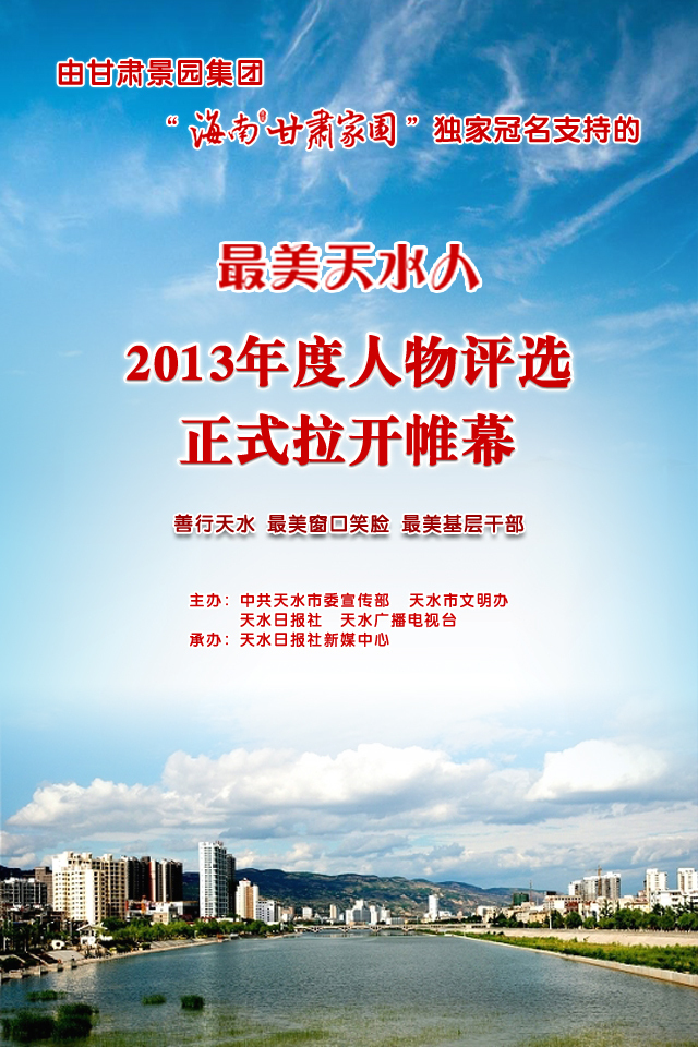 天天天水网讯 经过紧张筹备,备受社会各界关注的“最美天水人”2013年度人物评选今日起启动。这次由甘肃景园集团海南.甘肃家园独家冠名支持的典型人物评选活动,将从在过去一年中市属各媒体挖掘采访的八十余位“最美天水人”候选人中选出最终“善行天水”、“最美窗口笑脸”和“最美基层干部”三个门类的共计30位殊荣获得者并予以表彰。