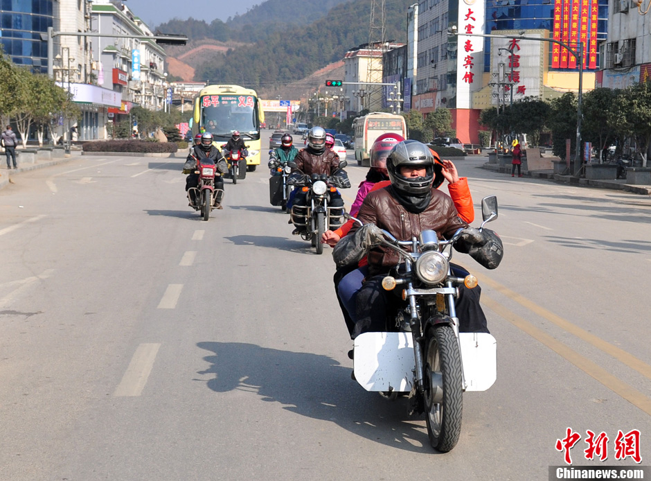 1月19日,返乡农民工骑摩托车行驶在江西省德兴市路段。2014年春运以来,江西省德兴市公路上每天有1000多辆(次)农民工的摩托车途经这里返乡。据了解,德兴是农民工从江浙沪骑摩托车返回赣东北的必经之路。胡敦煌 摄