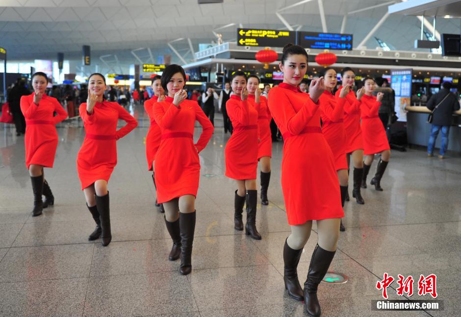 1月23日,机场工作人员在跳“快闪”舞蹈。当日,是中国传统佳节“小年”,沈阳桃仙国际机场当日以“快闪”舞蹈表演为旅客在佳节中带来了喜庆和愉悦。中新社发 于海洋 摄