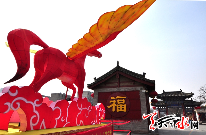 1月28日,天水伏羲庙前两座以龙马为原形制作的大型迎春灯亮相。整体设色为中国红,在云海中昂首向前的龙马,饱含龙马精神腾飞五洲。喜庆祥和的红与张开的双翼寓意着秦州人民在马年来临之际,吉祥如意,马到功成,以龙马精神开拓进取,通往直前。