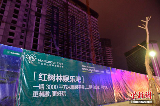 1月26日,三亚湾红树林度假世界项目周边关于“红树林娱乐吧”的宣传广告。中新社发 骆云飞 摄
