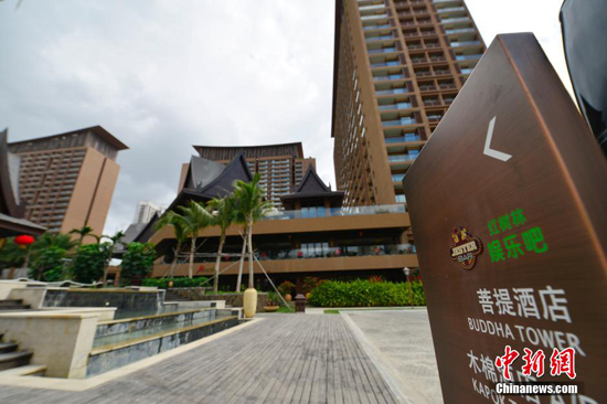 1月26日下午,三亚湾红树林度假世界酒店停车场指引娱乐吧方向的标示牌。中新社发 骆云飞 摄