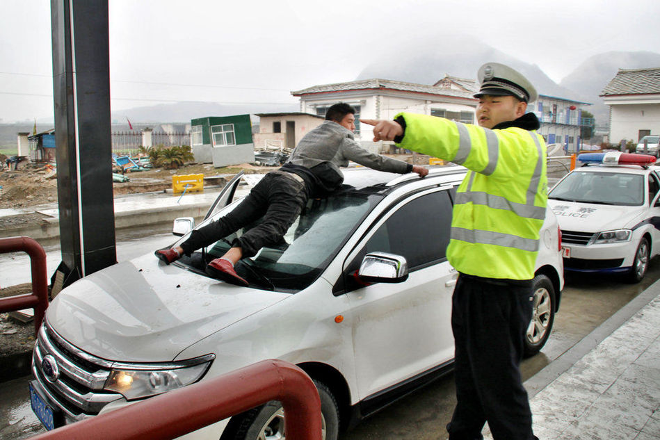 2月8日,贵州安顺,上午10点30许,省交警总队高速支队两警官驾车巡逻到沪昆高速贵阳往安顺1898公里处时,发现一辆白色越野车由贵阳往安顺方向高速行驶,而越野车前挡风玻璃与引擎盖上竟趴有一男子。两名警官立即驾车追赶,并拉响警笛喊话示意司机停车,但越野车却继续一路向前狂奔。