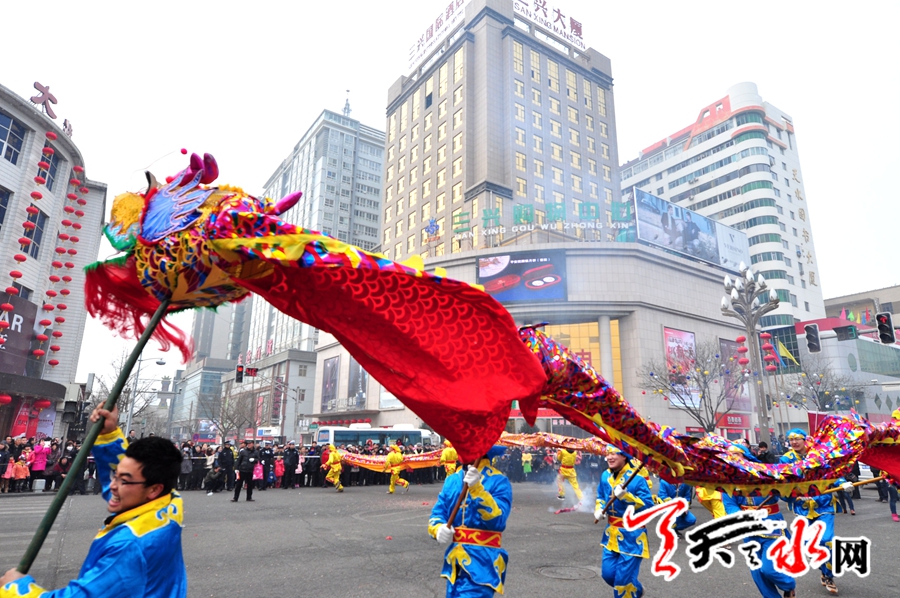 在天水,社火又称“秧歌”。每年到正月初九朝观结束,天水城区的街道、甚至机关单位的院落就会热闹起来,来自各单位和社区精心编排的社火表演队都会组织不同形式、不同内容的社火进城表演。其表演形式多为耍狮子、舞火龙、踩高跷、跑旱船、高台和杠老爷等等,内容丰富且各具特色。他们往往各自为阵,彼此呼应,由锣鼓开道、彩旗引路,队伍中穿插着大头娃娃、妖婆打诨惹笑等,数十只社火队伍浩浩荡荡、绵延不断,十分壮观。再配以天水独有的夹板舞,那手握夹板身着黄衣的男子,和着节拍动作统一,清脆悦耳的夹板声、唱彩声此起彼伏,更显年味十足!