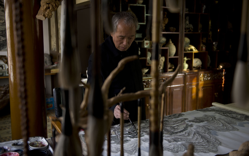 画如其人,张老师为人正直、低调,踏实,不好客套,他爱好广泛,除了书画之外,还爱武术、雕刻等,无论何种爱好,一旦干起来都很踏实。去过他家的人都知道,家里的家具都是他自己做的,床柜、书桌、椅子、台灯等。家里的根雕、花艺、盆景、工艺品都是出自他手。他用这种坚强、自信、踏实的精神,支撑着这个家,感染、鞭策着家人和周围的朋友。