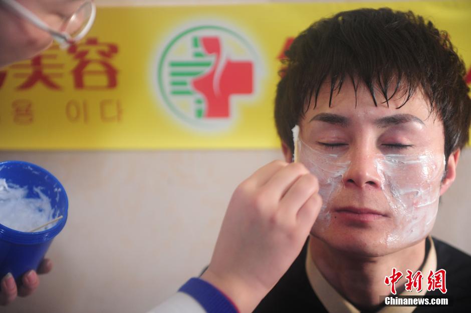 2月20日,安徽“公益明星”张艺冬在合肥某医院进行面部、额头、下巴微针注射,欲整形成“雷锋”,以此纪念雷锋。中新社发 张娅子 摄