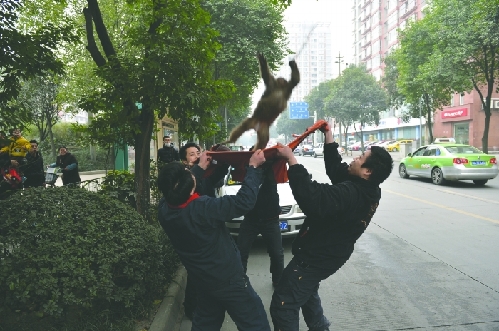 如何才能将它抓住?11时24分,一名市民取出一块米花糖,在猴哥伸手去拿米花糖时,麻醉针击中其肚皮。不过,挨了一针后,它竟然爬到树梢躲了起来。就在大家一筹莫展时,有人大喊一声:“遭了,猴子醉了!”循声望去,小猴哥松开了手掌,身体开始摇摇晃晃。