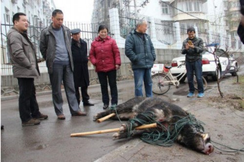 “野猪很重,估计有三百多斤。”一名民警说,将野猪击毙后,四名特警合力搬运,都感到很吃力。