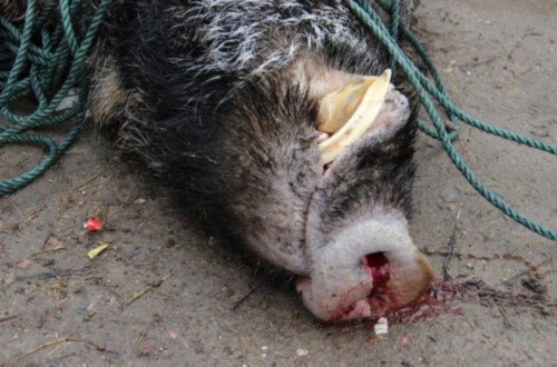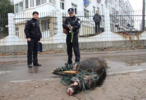 昨日清晨,一头重约300斤的黑色野猪在鄂州闹市区四处乱窜,先后将6名市民撞倒或咬伤。闻讯赶来的十几名民警一路追赶围捕,用了约两小时将野猪困在一处死角。因担心野猪再次伤人,经上级批准,鄂州市公安局果断处置,巡特警支队的一名狙击手用微型冲锋枪连开4枪,将这头肇事野猪击毙。