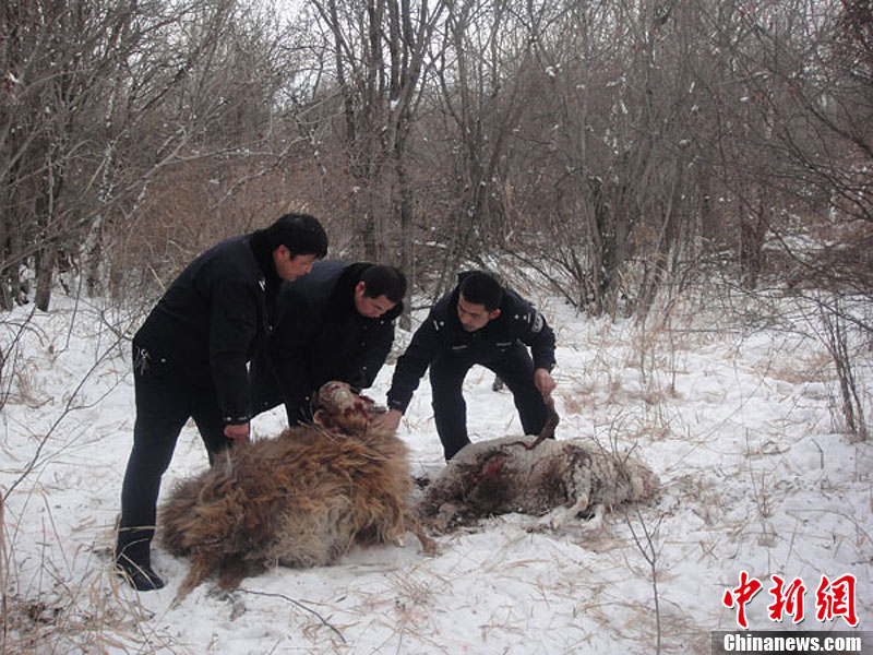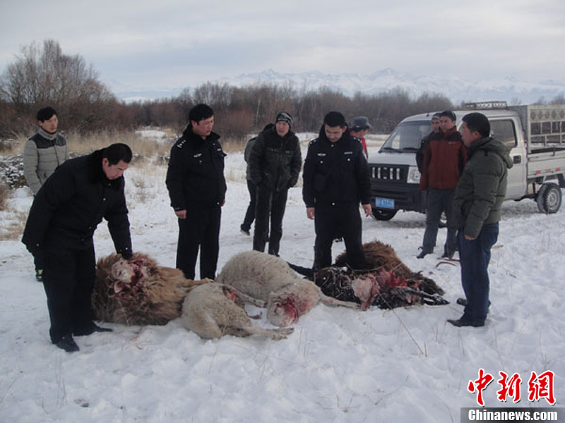 中新网伊犁2月27日电(蔡新玲) 27日,记者在新疆生产建设兵团第四师七十四团二连职工李洪帅的冬窝子附近看到,5只羊被野狼咬死的羊摆成了一排,惨不忍睹,在李洪帅家的羊圈内,还有13只被咬伤的羊,牧工叶儿别克还不时的用马从次森林拖出咬死的羊只。