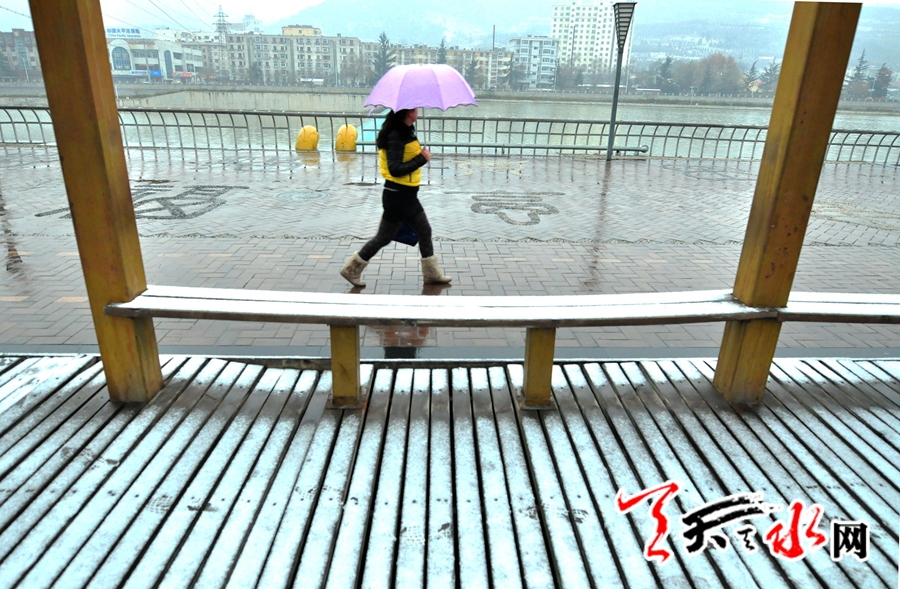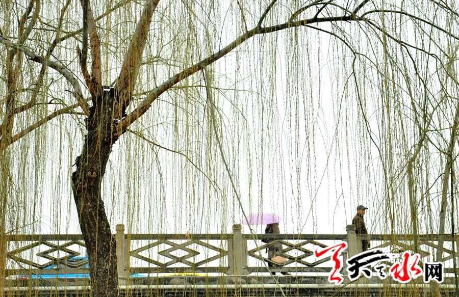 天天天水网讯:近日阴沉的天气让秦州的春天少了些许盎然的春意,28日清晨,天空飘落的小雪(雨)给这个不太给力春天染上了春的绿意。受来自北方冷空气过境影响,天水迎来春天里的小雪( 雨),外出的行人棉衣雨伞齐上阵,但藉河两岸的柳树已隐显出春的生机。