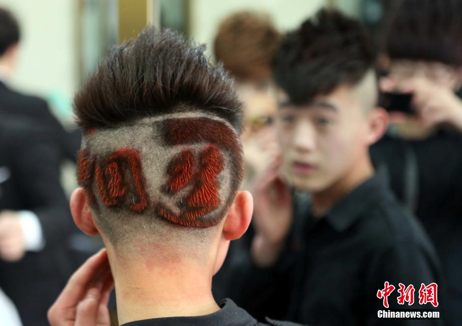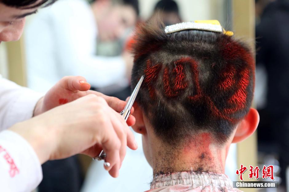 3月1日,在山西太原一美容理发店内,发型设计总监王剑特意给店内理发师设计了“中国梦”和“龙”两种造型来吸引顾客。明日为农历二月初二,也就是俗称的“龙抬头”,象征着春回大地、万物复苏,很多中国老百姓都有在这一天理发的习惯,希望新的一年能给自己带来好运气。图为理发师在给顾客理发。中新社发 张云 摄