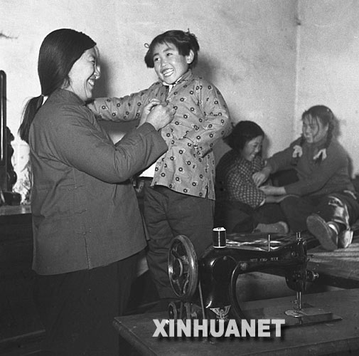 1954年春节,河北省唐山解家套农业生产合作社的小女孩陈小翠正在试穿妈妈刚做好的新衣。新华社发
