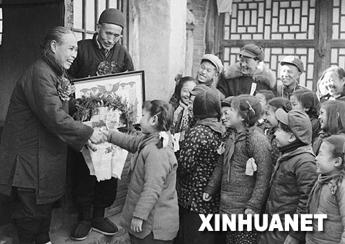 1955年春节,北京市的小学生们慰问军人家属洪老先生和洪老太太。新华社发