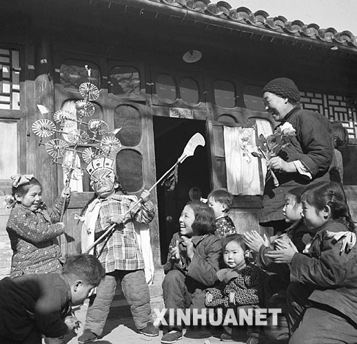 1956年春节,北京市宣武门外牛街的杨老太太正在看小孙女们游戏。 新华社发
