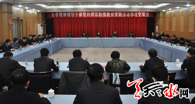 天天天水网讯【记者 孙燕芸】根据省委督导组意见和市级领导班子集中学习安排,3月2日下午,天水市召开地级领导干部党的群众路线教育实践活动学习交流会,交流近期学习教育的心得体会,以进一步增强学习效果,提高思想认识。中共天水市委书记王锐主持会议并讲话强调,要把学习贯穿整个教育实践活动始终,紧盯作风建设这个核心,发扬理论联系实际学风,切实把自己摆进去,努力将学习再深化,抓紧抓实抓好教育实践活动第一环节各项工作,为搞好整个活动打牢坚实基础。