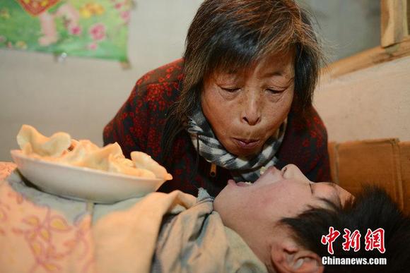 2月25日下午,58岁的王均秀在嘴对嘴地喂养躺在炕上的一位“女婴”。这个像女婴一样的女孩是一个残疾弃婴,患先天性脑瘫,没有咀嚼功能,失语、大小便失禁,四肢关节僵硬不能活动,至今未发育。 陈为峰 摄 图片来源:CFP视觉中国