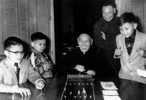 1950年代,蒋介石和孙子和友人的孩子玩游戏。蒋孝武玩得投入,孝勇还小,不太进入状况。蒋经国总是在父亲身后看着父亲和儿子玩耍,把自己当成配角,讨爸爸开心。
