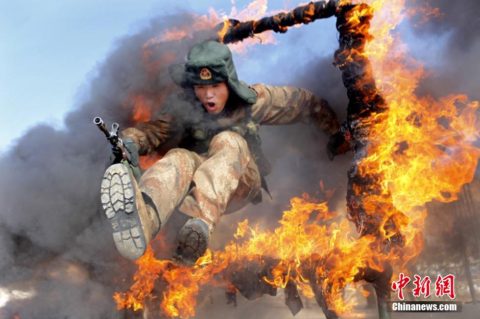 3月5日,黑龙江省军区边防某团官兵正在进行跨越火圈的实战训练。该部结合未来边境作战特点,设置模拟化战场环境,营造硝烟滚滚、枪林弹雨、炮声隆隆的实战氛围,从难从严从实战角度出发,深化“仗怎么打、兵怎么练”的实战练兵力度,着力提升部队实战条件下的作战能力,锤炼官兵敢打硬拼的过硬战斗作风。中新社发 魏建顺 摄