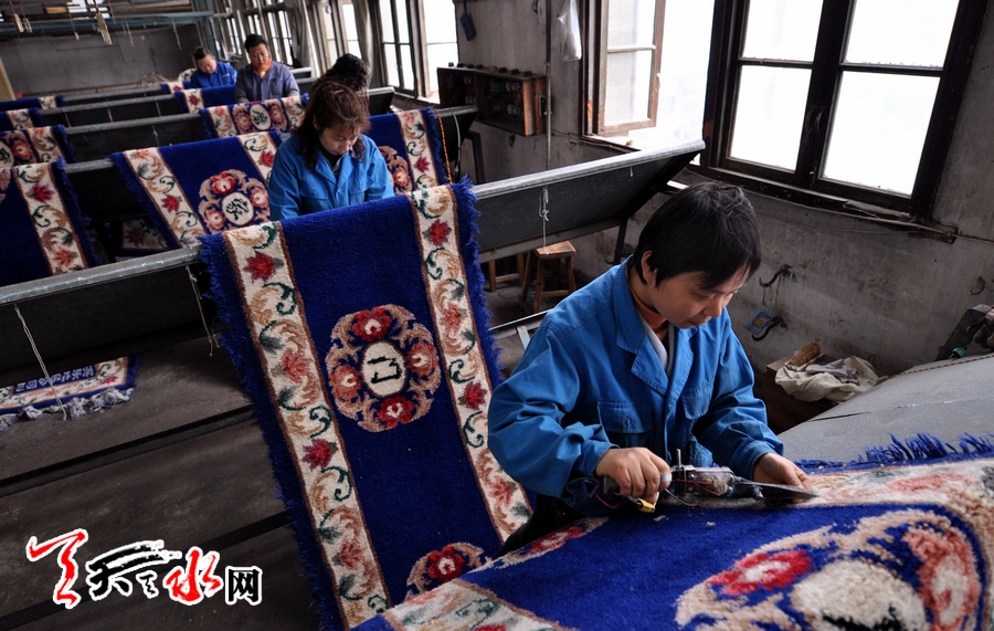天水宾乐地毯厂的女工们正在修剪地毯。天水作为丝绸之路要冲,得天独厚的羊毛资源为天水地毯手工业提供了健康的发展。始于民国的天水地毯,亦成为富有民族特色与地方特色的工艺品之一,所织造的产品尤以仿古地毯著称中外,被国际市场誉为“象锦锻一样光彩夺目的软浮雕”,天水地毯厂为此也为古城天水的文化个性涂抹上了一层富地域特色的辉煌,90代初期,天水地毯人用智慧的双手织造出了仅少于世界地毯吉尼斯世界纪录2.82平方米的“中国地毯之最”,陈设在北京人民大会堂甘肃厅,总面积达102.18平方米。