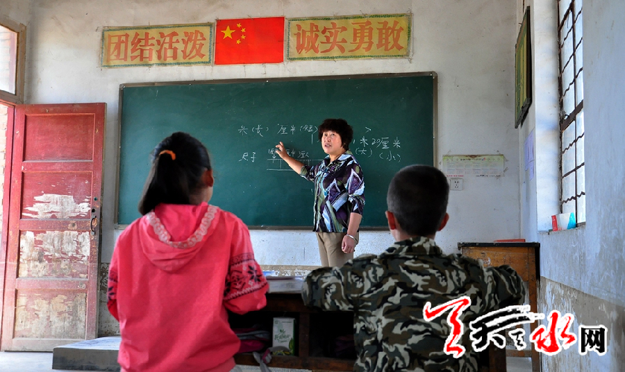 刘娥娥老师在给二年级的两同学上课. 2013年7月,一场突如其来的暴洪灾害让这所平日里寂静的山村小学遭受了史无前例的重创,暴洪无情地摧毁了两百余米长的校园围墙,校门被冲走,10间教室和办公室内课桌板凳和教学用具等物品均浸泡的六七十公分深的洪水中……然而暴洪的无情肆虐没有淹没朗朗的读书声,暴洪过后的第一个开学季。8月25日,在校长李存娃、老师刘娥娥、刘明星、何海军的共同努力下,钱家坝小学16名学生朗朗的读书声又回荡在灾区的上空,而支撑这一切的背后,就是他们始终深信的一个信念,“只要有一个学生报名就要正常开学”