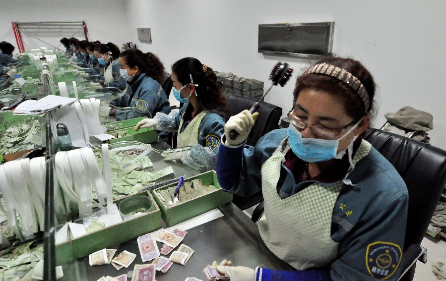 “一天磨破一双手套。腱鞘炎、肩周炎、腰脊酸痛已经是我们这些人常见病。”一位常年在这里数钱的工作人员边用按摩锤敲打酸痛的背部边说。在点钞室内,33名点钞女工,每天十几万张一元、五角、一角的纸币及部分硬币,从早上七点半到下午一两点的六、七个小时里要经过一双双不停歇的手清点完毕,并按照银行的专业要求,一捆一捆打好。该中心主任张涛说,工作在这里的33名女工,一年没有节假日,常年不能在家为孩子做午饭,相反节假日期间,清点纸币的量要比平时多出三分之一左右,这样一来,长时间高强度的工作让工作在这里33名女工程度不同地患上腱鞘炎、肩周炎、腰脊酸痛等职业病。用龙城一卡能公司经理助理马斌的话说,除了上厕所,她们从上班到下班,坐在椅子上要双不停地数,数钱数到手抽筋在这里已不是笑话。因长时间坐着工作,她们坐的椅子上都垫上了厚厚的垫子,每个人的脚上还垫上木制脚垫。据马斌介绍,今年IC卡发行整五年,目前累计发行各类公交IC卡为33万余张,持卡率达70%以上,市民公交卡使用率达30%。其余20%多以投币方式乘车。据张涛反映,在清点过程中,时常会出现假币或是残币,部分乘客在投过程中把纸币卷成一个棒,希望广大乘客在投过程中把纸币展开。