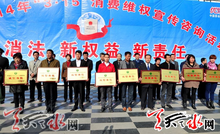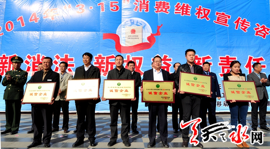 活动中,对荣获省级“诚信单位”称号的天水兰天城市广场有限公司、中国电信股份有限公司天水分公司、天水荣发建材有限责任公司等六家企业颁发了奖牌。同时对荣获市级“诚信单位”的甘肃友联工贸有限公司、安利(中国)日用品有限公司天水分公司等25家企业颁发了奖牌。