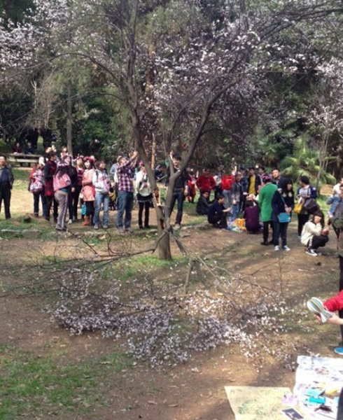昨日,多名武大学生反映,他们在校内情人坡看樱花时,不仅发现一些游客随意采摘樱花,还发现一棵3米多高的樱花树的树枝惨遭人为折断(如图)。