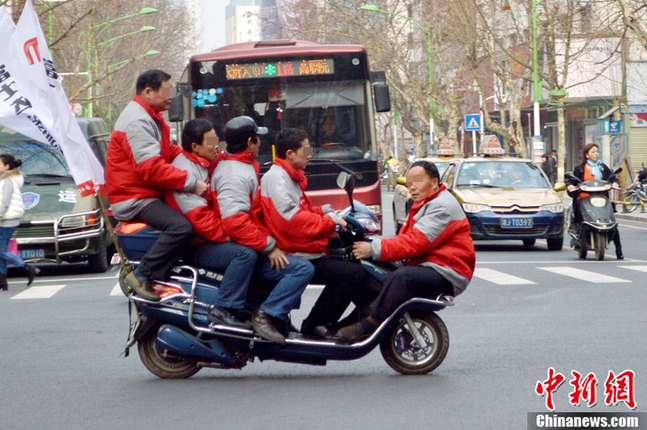 3月16日上午,湖南常德城区青年路与人民路交叉路口,五男子同坐一台电动车在街头行驶,上演“马路杂技”。陈自德 摄 图片来源:CFP视觉中国