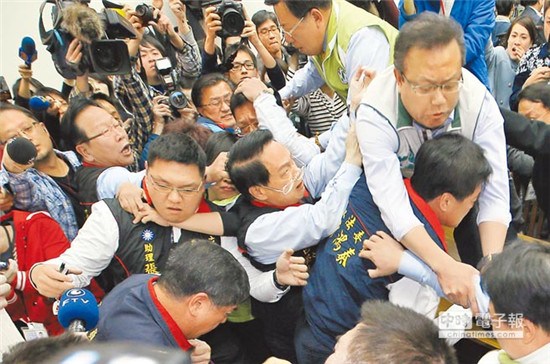 《两岸服务贸易协议》17日再度闯关台湾“立法院”,会议主席张庆忠(左下)遭多位民进党“立法委员”跳上桌子包夹,蓝营“委员”全都蜂拥帮忙,双方发生多次推挤,场面相当混乱。(台湾《中国时报》图 陈信翰摄)
