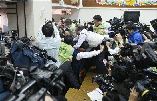 台湾“立法院”内政委员会等8个常设委员会17日下午联席初审《海峡两岸服务贸易协议》,朝野“立法委员”陷入扭打。“中央社”图