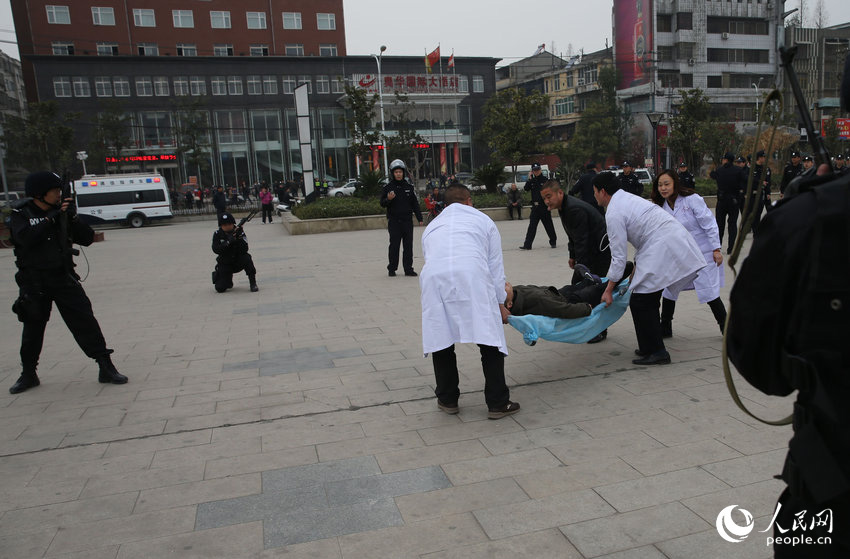 医护人员抢救被特警击中的持刀行凶者。王虎/CFP