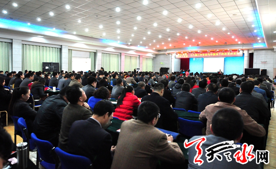 旨在为了让广大干部群众更加深入学习贯彻党的十八届三中全会精神,理解《决定》对于中国当下 改革和发展的重大意义和指导思想,推动天水改革发展的此次讲座,主讲人陈宪运用通俗的语言,深刻阐述了党的十八届三中全会对于当下中国改革与发展的重大指导意义,围绕大会提出的新思想、新观点、新论断,进行了深入浅出的诠释和解读,讲座数据事例丰富,观点导向清晰,既有理论的高度深度,又有很强的现实针对性,对于更好学习、领会和把握党的十八届三中全会精神,以党的群众路线教育实践活动为契机,扎实推进天水全面深化改革各项工作,具有重要的学习意义和借鉴价值。