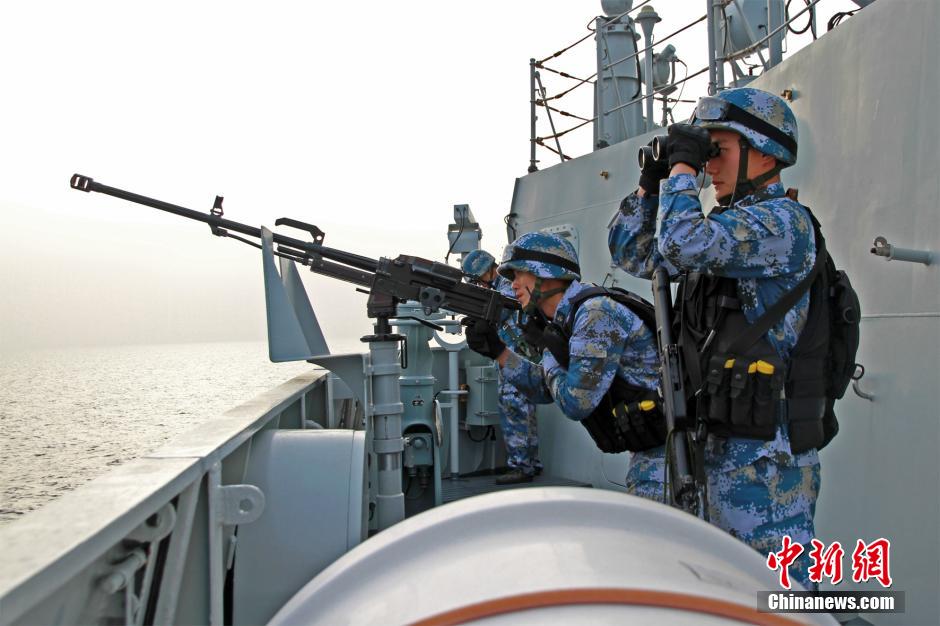 当地时间3月17日17时40分,在中俄、丹挪舰艇编队的联合护航下,负责运输叙利亚化学武器的挪威运输船安全驶出叙利亚领海。至此,中国海军黄山舰顺利完成第十批叙化武海运护航任务。图为出港时高度警戒的特战队员。中新社发 徐广 摄