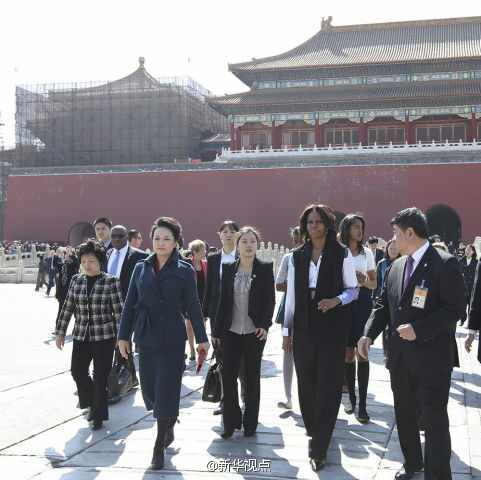 【彭丽媛和米歇尔一起参观故宫】21日,彭丽媛和米歇尔一起参观故宫。故宫博物院院长单霁翔介绍说,故宫在北京的中轴线上。在美国华盛顿,国会山到林肯纪念堂也在一条中轴线上,这说明中美在建筑和城市规划上也有相通之处。