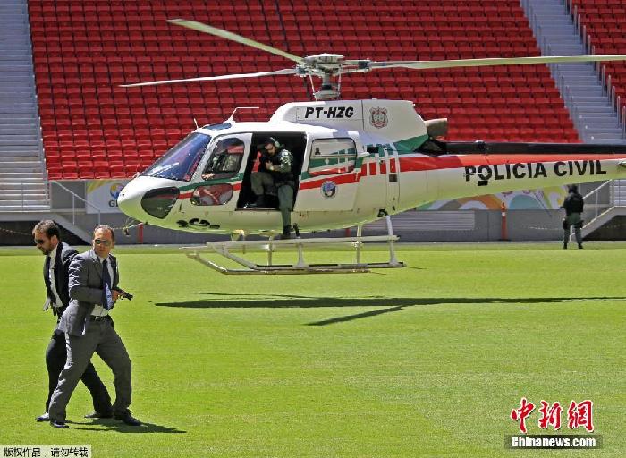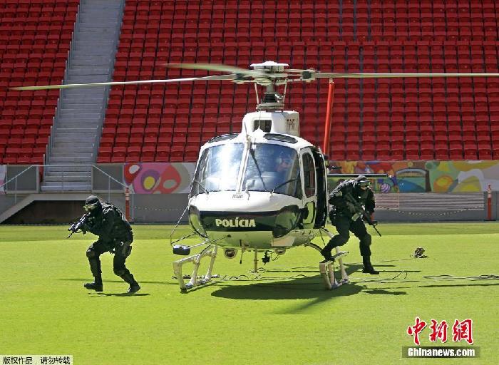 当地时间3月19日,巴西首都巴西利亚国家体育场,作为2014年世界杯七个承办球场之一,巴西警方在球场内出动直升机进行安保反恐演习。