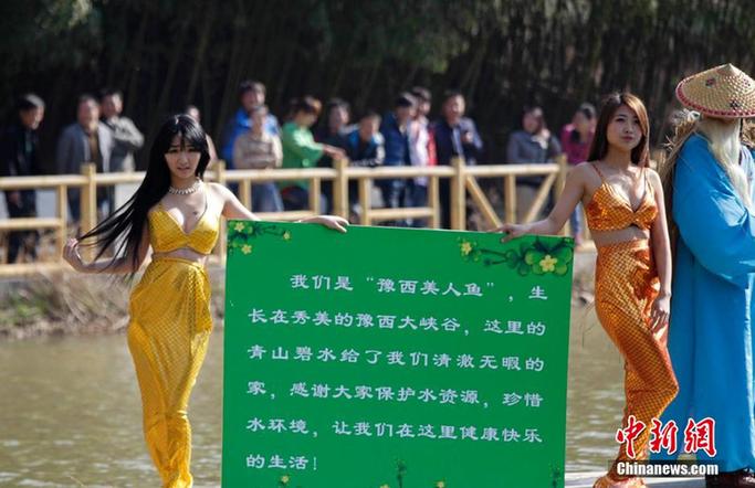 3月22日,河南三门峡豫西大峡谷,两名“美人鱼”戴着防毒面具邀请民众签字保护水质拒绝污染,并赠送五彩水滑石。中新社发 王中举 摄