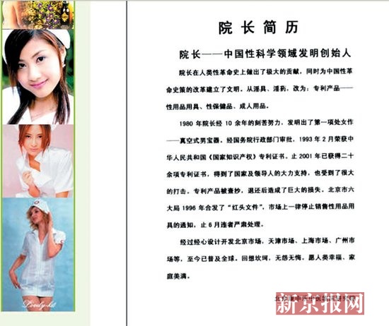 网站上院长简介,称其为“中国性科学领域发明创始人”,网页滚动显示的是各种性感图片。