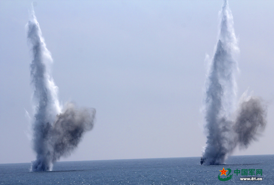 3月18日,南海舰队某大队由3艘猎潜艇组成编队与潜艇对抗演练。编队指挥员根据海情形势分析,果断指挥,命令编队按照攻潜队形散开,扩大与目标的舷角。发现目标后,编队立即从不同方向、不同距离发射数枚火箭深弹直扑大海深处。来源:中国军网 通讯员 胡开元 摄