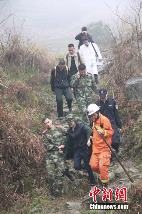 3月23日,江西宜春明月山崎岖的山路上,两名消防官兵搀扶着一名受伤的女大学生下山。陈乃国 摄