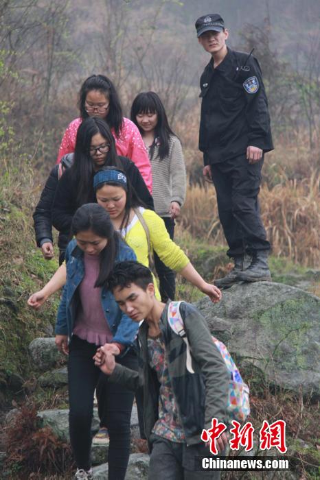 3月23日,江西宜春明月山崎岖的山路上,消防官兵和特警护送迷路的大学生下山。邹海斌 摄