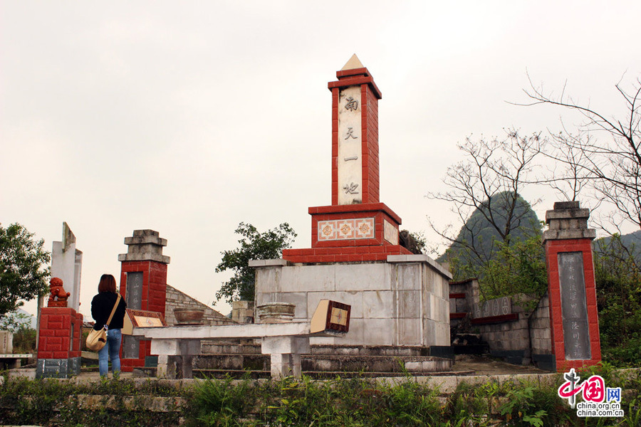 在这座墓右侧路边,还立有一块约两米高的石碑,上书“半里出州”四个大字,旁边还有一张装饰有字画的石凳。