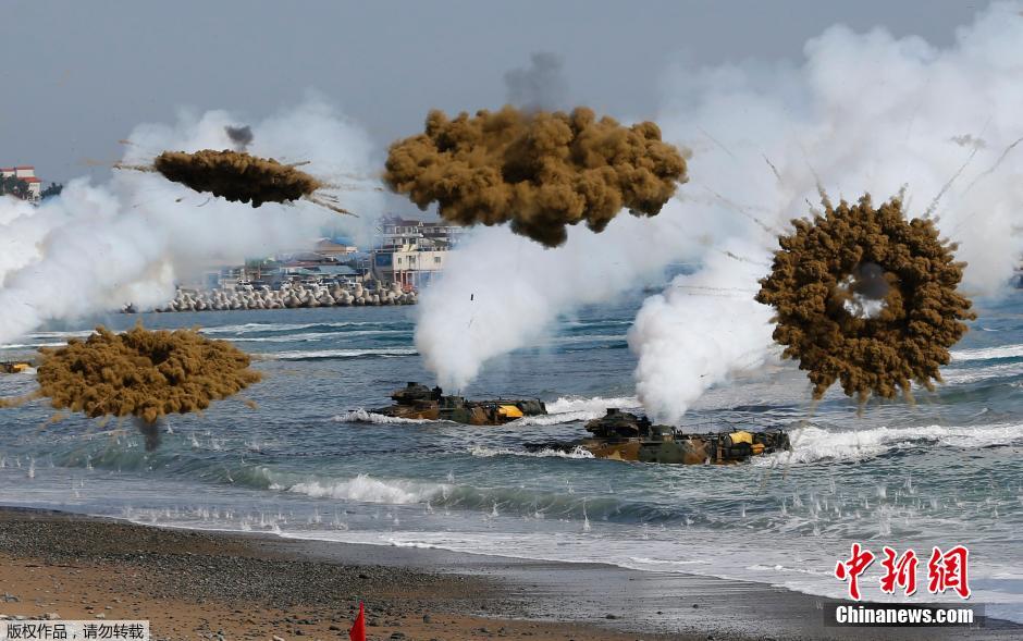 当地时间2014年3月31日,韩国浦项,韩美联合登陆演习(CJLOTS)进行,该演习是韩美年度军事演习“雏鹰”的一部分。据韩联社3月27日报道,韩美海军和海军陆战队27日开始举行名为“双龙”的联合登陆作战演习,演习将持续到4月7日。今年的参演兵力是1993年“团队精神”军演后的最大规模。