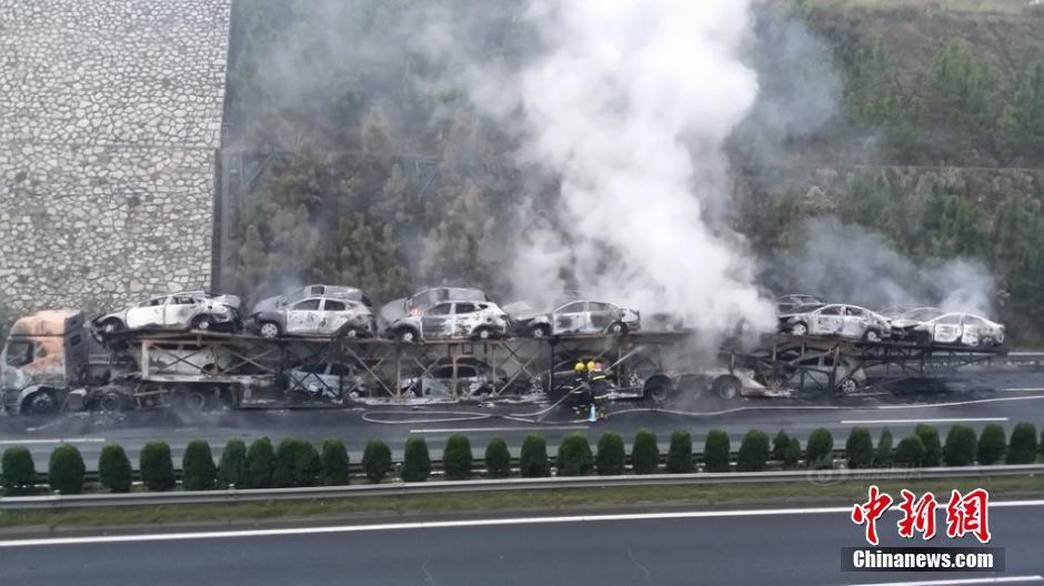 据货车司机介绍,该车从吉林开往广州,车上装有20多辆轿车等。当车行驶到3015公桩处,他看到车尾左轮胎部位冒出黑烟和火苗,立即停车用车上灭火器灭火。但由于火势较大,车上可燃物较多,火势无法控制并迅速向车身、油箱蔓延。