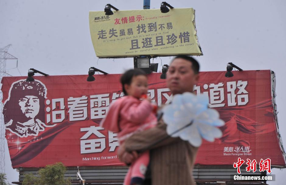 4月2日,重庆洋人街出现大量“伊琍体”标语。“走失虽易,找到不易,且逛且珍惜”、“驾驶虽易,安全不易,且开且珍惜”、“生活虽易,欢乐不易,且玩且珍惜”、“恋爱虽易,结婚不易,且行且珍惜”等标语植入洋人街景区的“吃喝玩乐”。中新社发 陈超 摄。
