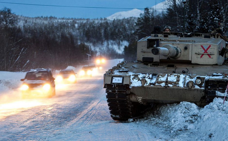 与一般在各国封闭军区进行的军演完全不同,“寒冷反应”军演通常在平民区进行。图为挪威一个机械化步兵营--泰勒马克营在挪威北部一条繁忙的主干道上进行军演准备。挪威市民也驾车在道路上行驶,丝毫未受到影响。