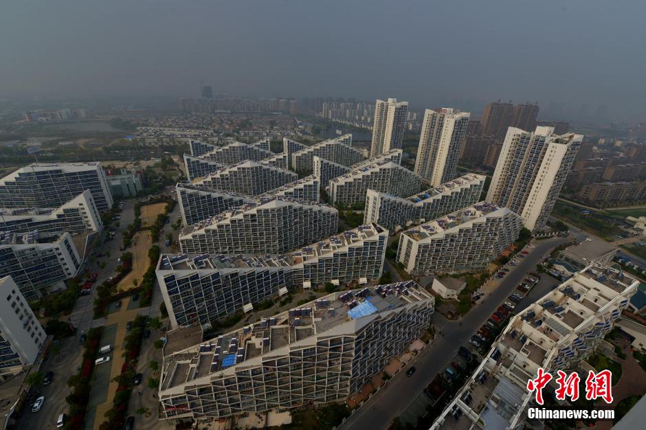 4月8日,无锡惠山区一处小区外立面造型凹凸有致,色彩丰富,十分引人注目。据了解,该楼盘由国外设计师以“波谱”理念设计而成,由于造型较为新颖奇特颇受年轻新市民喜爱,而年长者则多认为“太怪”难以接受。中新社发 李一芳 摄